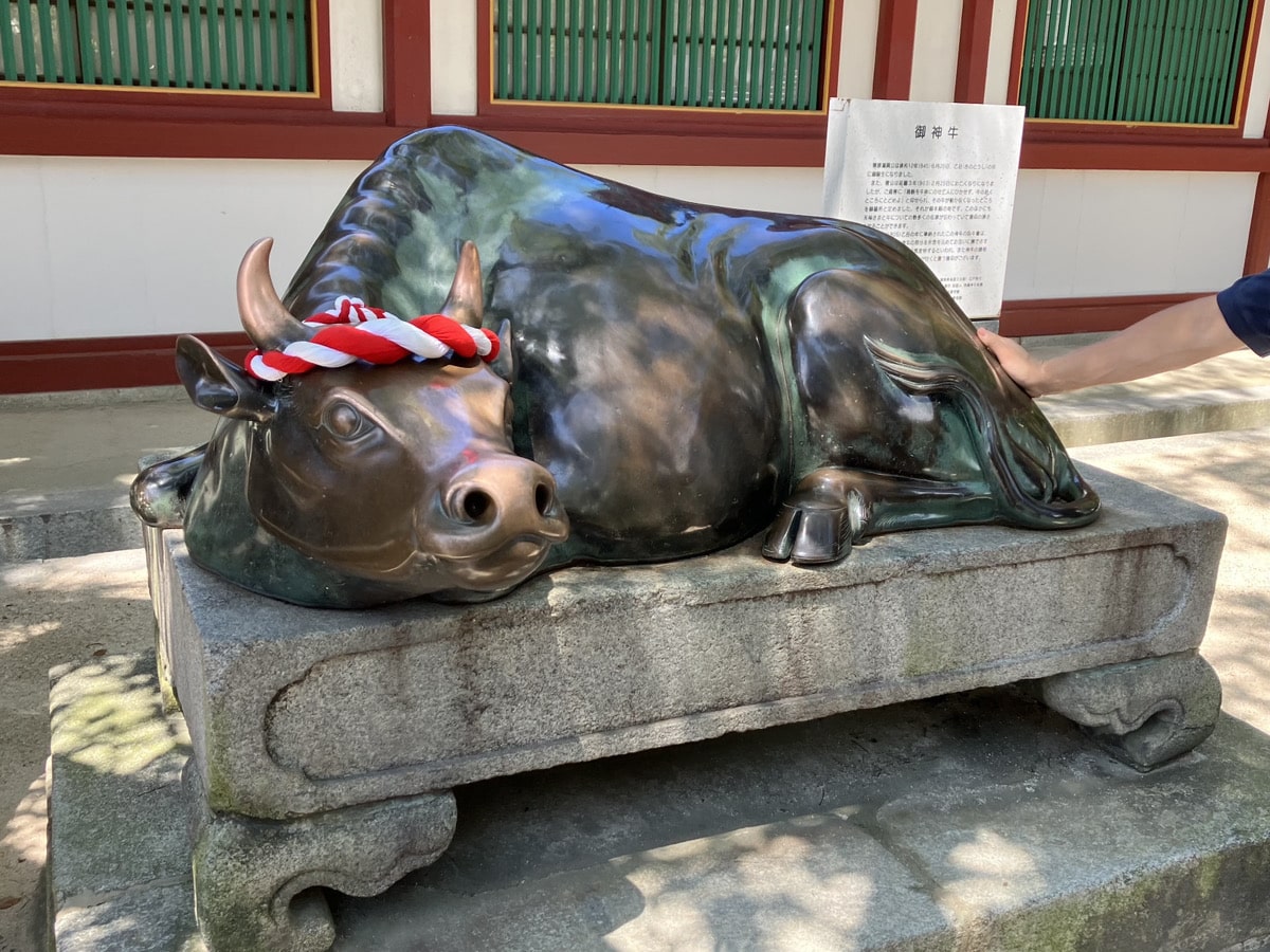 御神牛像があり頭を撫でることで知恵を授かれるとされています。